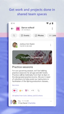 ارتقِ بقدراتك التعاونية وحقق مشاريعك وخططك المشتركة بفعالية غير مسبوقة. يتيح لك Microsoft Teams تبادل الصور والفيديوهات في الدردشات بسرعة فائقة، والوصول إلى مستنداتك وملفاتك المشتركة من أي مكان بفضل التخزين السحابي. نظم محتواك المشترك – من أحداث وصور وروابط وملفات – داخل المجتمعات لضمان عدم إضاعة الوقت في البحث.* استفد أقصى استفادة من اجتماعاتك بفضل ميزات مشاركة الشاشة، والسبورة البيضاء، والغرف الفرعية الافتراضية. حافظ على تقدم المشاريع والخطط باستخدام قوائم المهام؛ عيّن المهام، حدد المواعيد النهائية، وضع علامة على العناصر المكتملة ليبقى الجميع على اطلاع دائم.