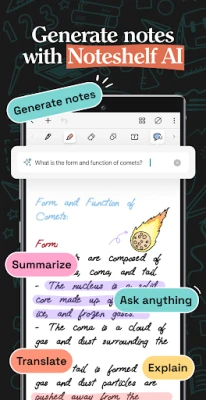 تجاوز حدود التدوين التقليدي؛ اكتب، اطبع، ارسم، أو سجل صوتك بحرية تامة. حوّل خطوطك إلى أشكال هندسية مثالية تلقائيًا، أو استخدم الأشكال الجاهزة لإنشاء مخططات انسيابية ورسوم بيانية احترافية. سجل الصوت أثناء تدوين الملاحظات لضمان عدم فوات أي تفصيل مهم في المحاضرات والاجتماعات. حوّل الملاحظات المكتوبة بخط اليد إلى نص قابل للبحث، بفضل ميزة التعرف على الخط اليدوي التي تدعم 65 لغة. أضف لمسة من المرح والإبداع إلى كل صفحة بالملصقات الجذابة، واستكمل ملاحظاتك بالمرئيات المثالية من مكتبات UNSPLASH وPIXABAY الغنية، واستفد من ميزات تحرير الصور المتقدمة مثل إزالة الخلفية والقص الحر. دع Noteshelf AI يقوم بالمهام الثقيلة؛ ولِّد ملاحظات مكتوبة بخط اليد عن أي موضوع، ولخّص صفحات كاملة، وترجم النصوص، واشرح المصطلحات المعقدة والمزيد، كل ذلك بذكاء.